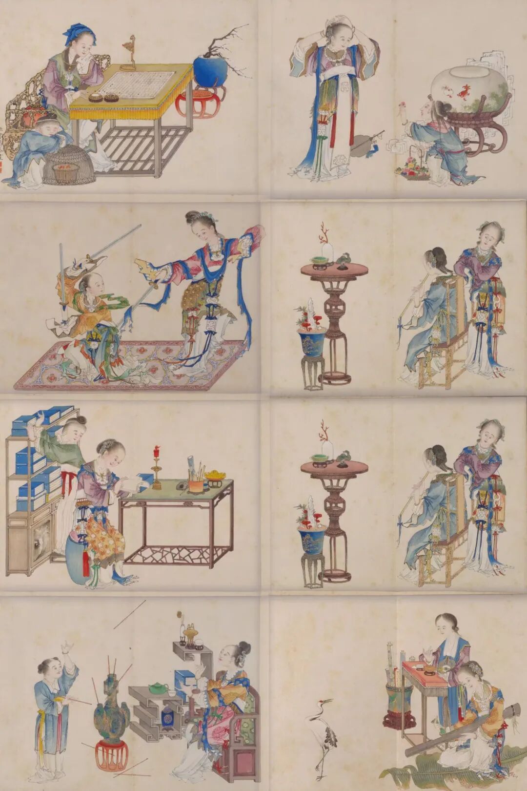 《仕女清娱图》册,清,喻兰绘。此图册共8幅。多种行乐活动,说明了优越的生活环境不仅保障了她们衣食无忧,亦为她们提供了种种休闲条件。来源/故宫博物院