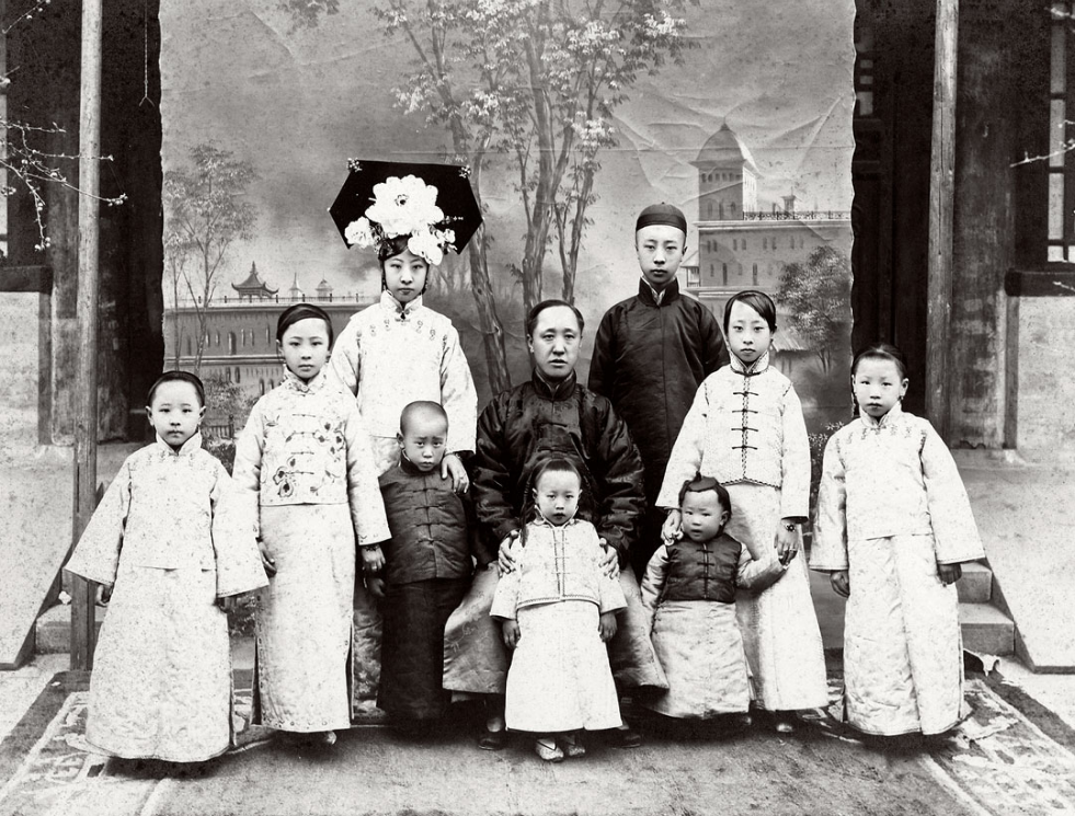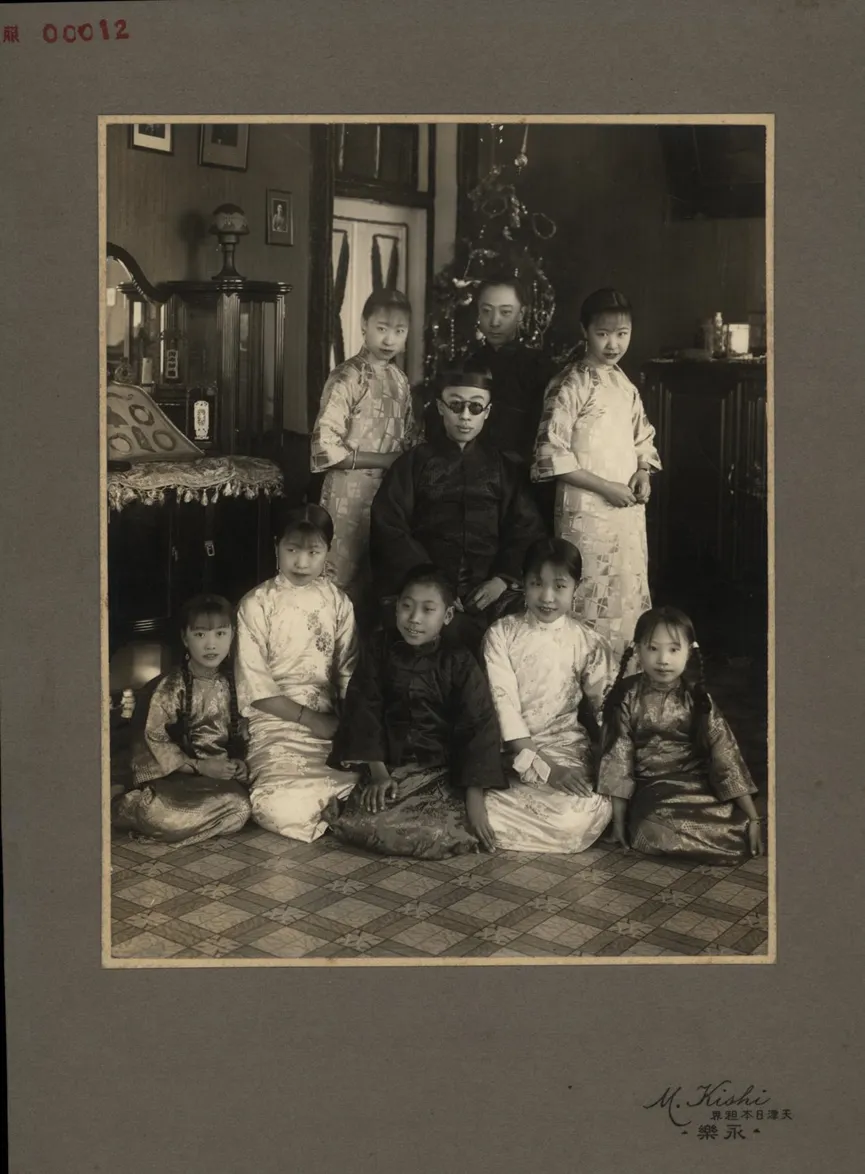 载沣与溥仪兄妹合影。后排左起:韫媖(载沣长女)、载沣、溥仪;前排左起:韫馨(载沣五女)、韫颖(载沣三女)、溥任(载沣四子)、韫娱(载沣六女)、韫欢(载丰七女)、韫和(载沣次女)、韫娴(载沣四女)。来源/故宫博物院
