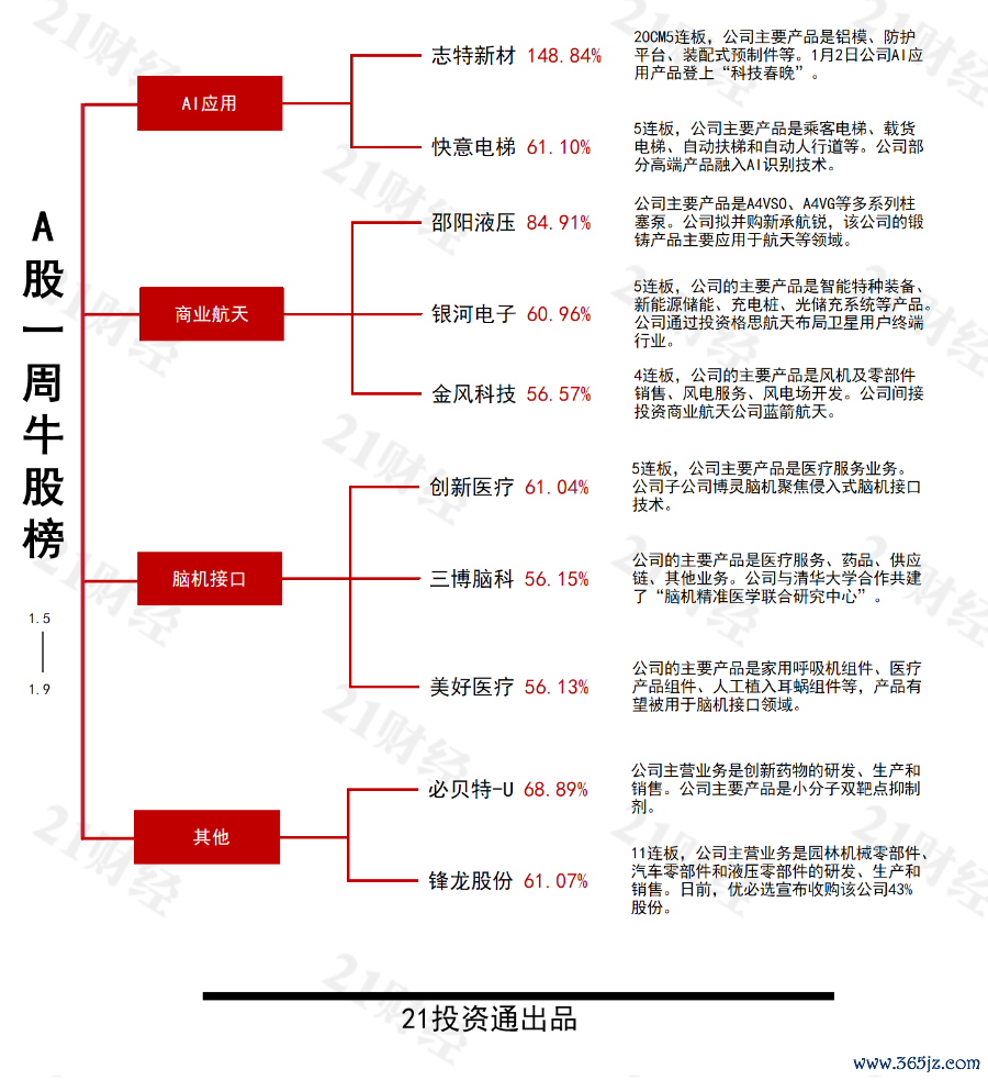 本期牛股榜中,志特新材(300986.SZ)以148.84%的周涨幅夺魁,邵阳液压(301079.SZ)以84.91%的涨幅位居第二,必贝特-U(688759.SH)、快意电梯(002774.SZ)、锋龙股份(002931.SZ)、创新医疗(002173.SZ)等股周涨幅均超61%。本期牛股榜十只个股过去一周累计涨幅均超过56%。值得关注的是,本周牛股榜中包含近期多个热门概念股,如AI应用、商业航天、脑机接口等。