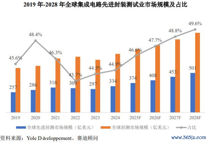 先进封装测试占整体封测的比例逐步提高。2024年先进封装测试业市场规模占比达44.9%,市场预测,2028年先进封装测试业市场规模占比将近50%。