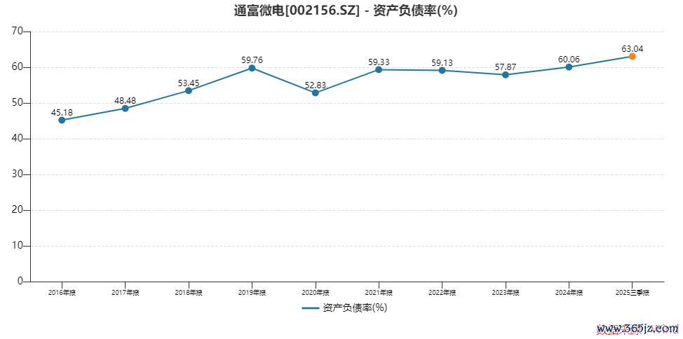 集成电路封测行业为资金密集型,通富微电资产负债率已是上市以来新高。2024年末公司资产负债率首次突破60%,截至2025年三季度末,资产负债率为63.04%,较上年末又增加了约3个百分点。